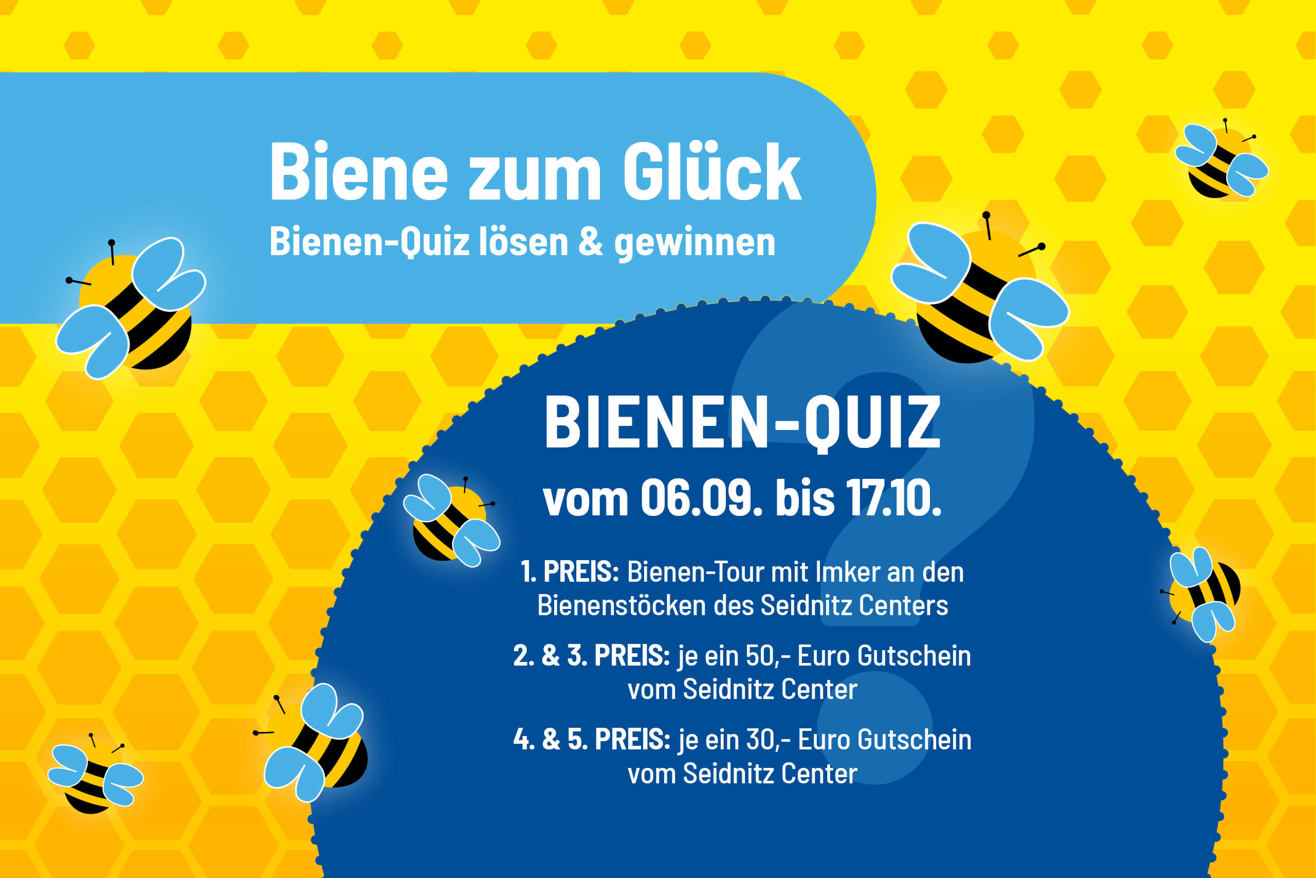 Summ, summ, summ – jetzt wird’s spannend im Seidnitz Center! Beim großen Bienen-Quiz vom 06. September bis 17. Oktober könnt ihr nicht nur euer Wissen über die fleißigen Honiglieferanten testen, sondern auch tolle Preise gewinnen. Macht mit und erlebt den Spaß für die ganze Familie!